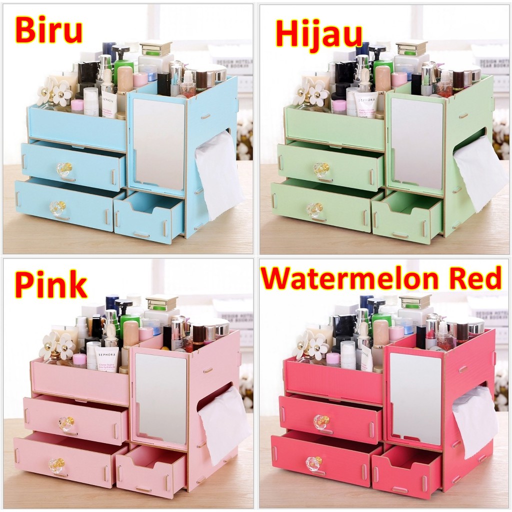 Rak kosmetik dari bahan kayu ringan Ada lacinya juga ada sekat khusus untuk tempat tissue dilengkapi cermin Cocok untuk tempat kosmetik dan aksesoris membantu merapikan meja rias yang berserakan Terdiri dari 2 laci 1 sekat kecil 1 sekat besar 1 tempat tissue dan 1 kaca Ukuran 25 5 x 16 5 x 19 cm Bahan kayu MDF 3 ML